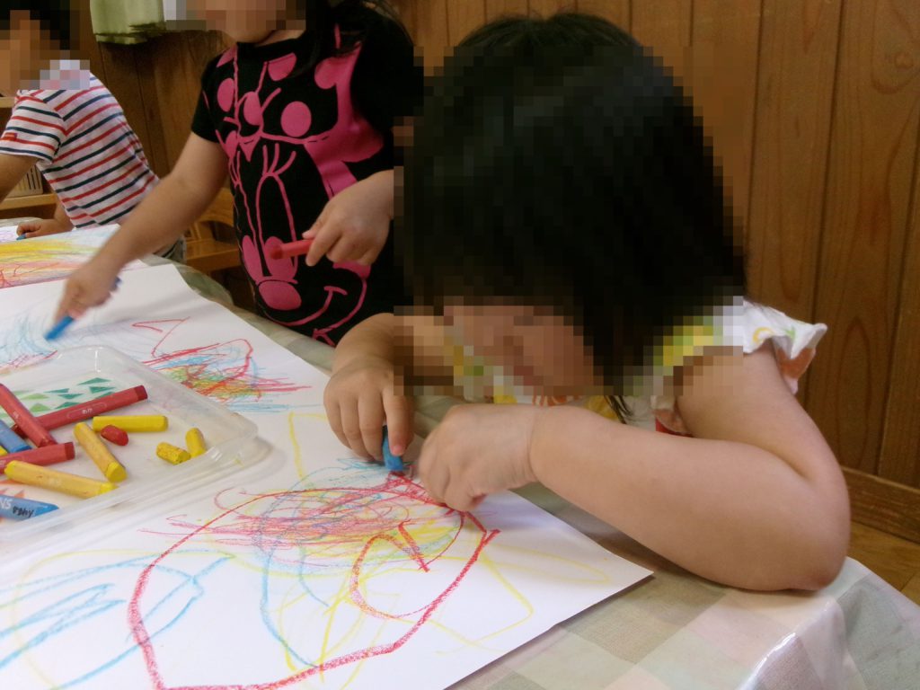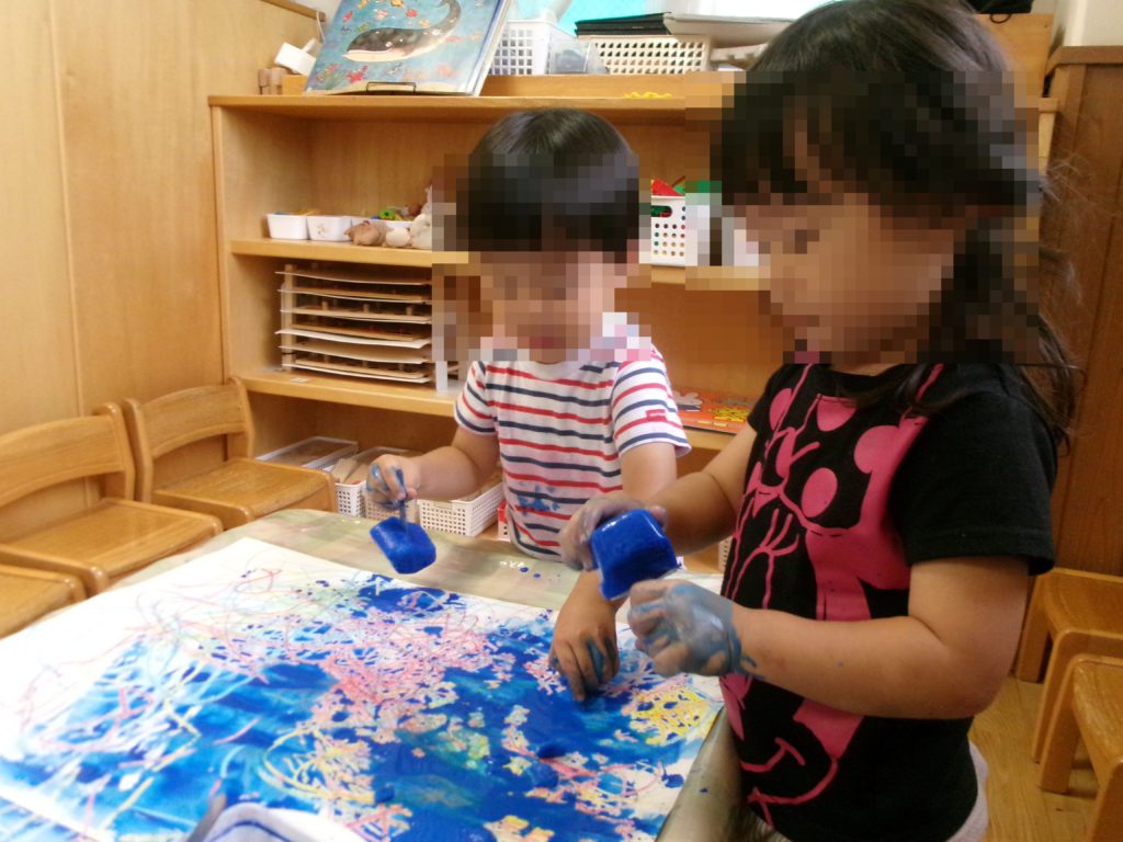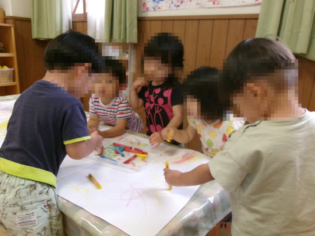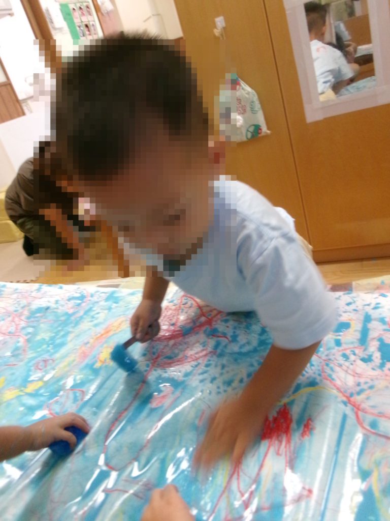 水を描くとクレヨンで描いたお魚が浮き出てきて「これ〇〇のおさかな!」と発見したり、氷をさわって「つめたい!」と感触を楽しみました。最後は氷絵の具をコンコンと打ち付けて砕き、シャーベット状になった氷をみて「かきごおりだ!」と見立てて楽しむ子どもたちでした。