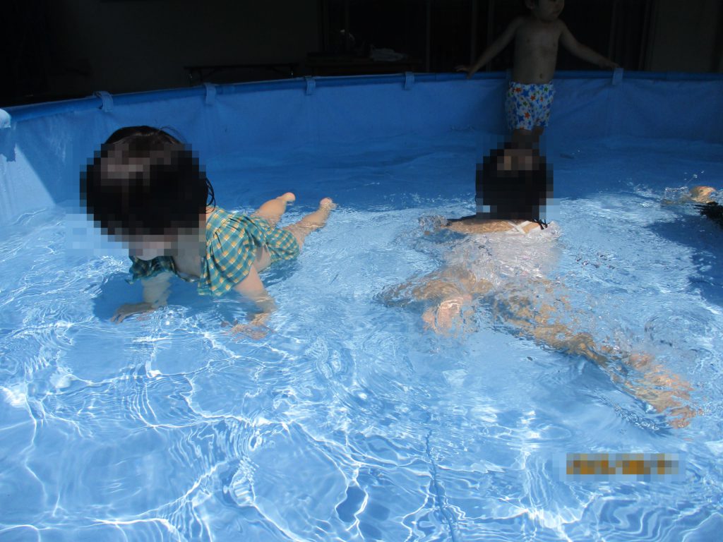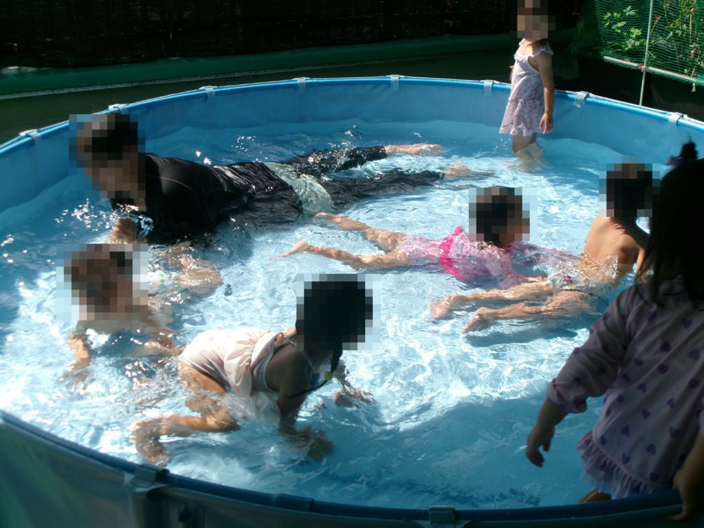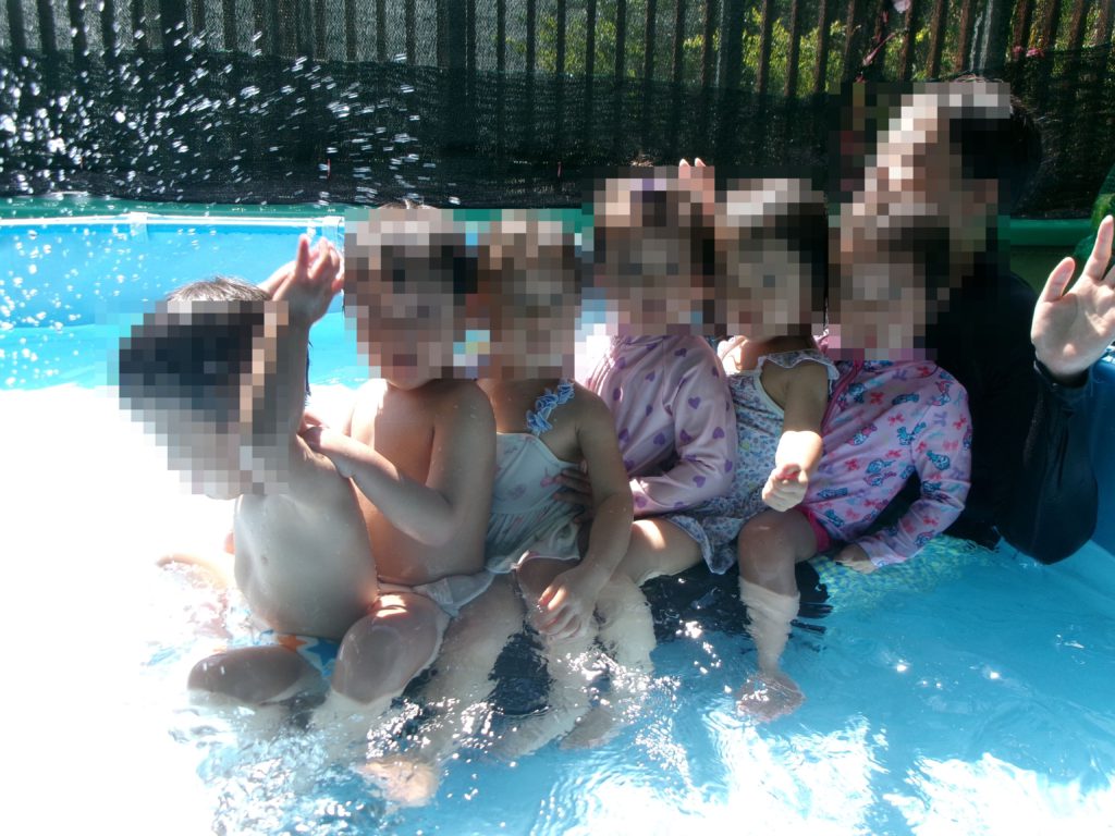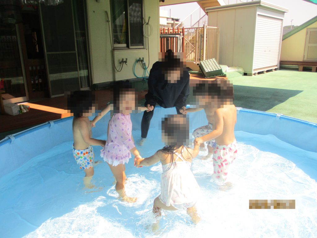 ワニ泳ぎやカエル、イルカジャンプなどをして水の中で体を動かしています。「いちごになる!」「〇〇はくるまになる!」と子どもたちは好きなものになりきって泳ぎ、とっても気持ちよさそうです。わらべうたの「こりゃどこのじぞうさん」を歌って「どっぼーん!」としりもちをついて笑い合う子どもたちです!