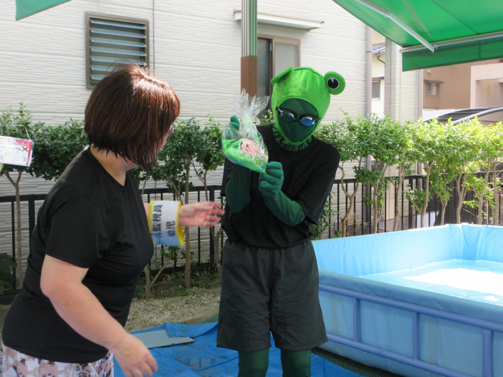 プールから上がってぴょんきちからペンダントをもらい子どもたちは大喜び!最後にぴょんきちと記念撮影をして「またきてね!またあそぼうね!」と言ってお別れをしました。