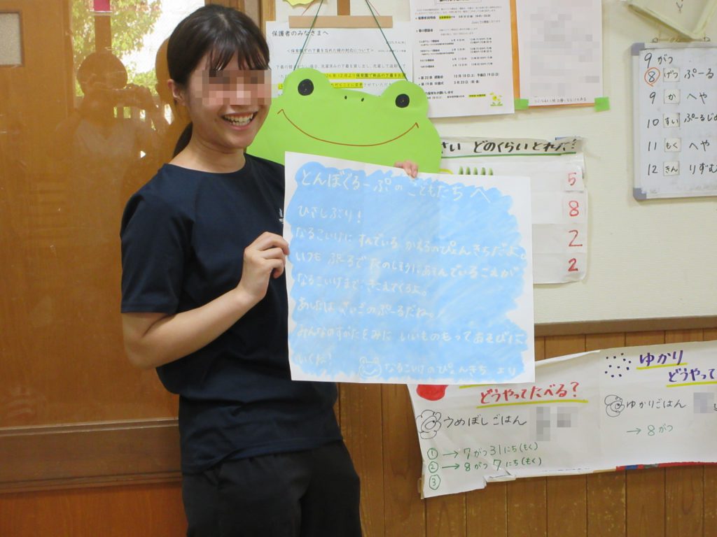 前日に鳴子池に住むぴょんきちからお手紙が届きました。手紙を見た子どもたちは「明日ぴょんきち来る!」とまた会えることやぴょんきちに「かおつけみてもらう!」とできるようになったことを見てもらいたくて張り切っていました。