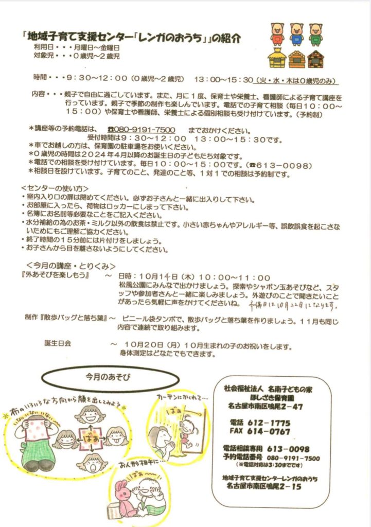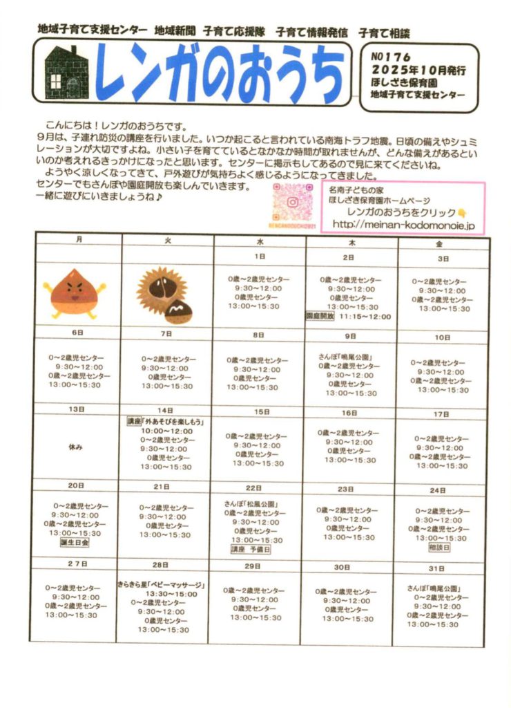 ようやく涼しくなってきて、外あそびが気持ちよく感じるようになってきました。今月はさんぽや園庭開放も楽しんでいきます。一緒にあそびに行きましょうね🎵