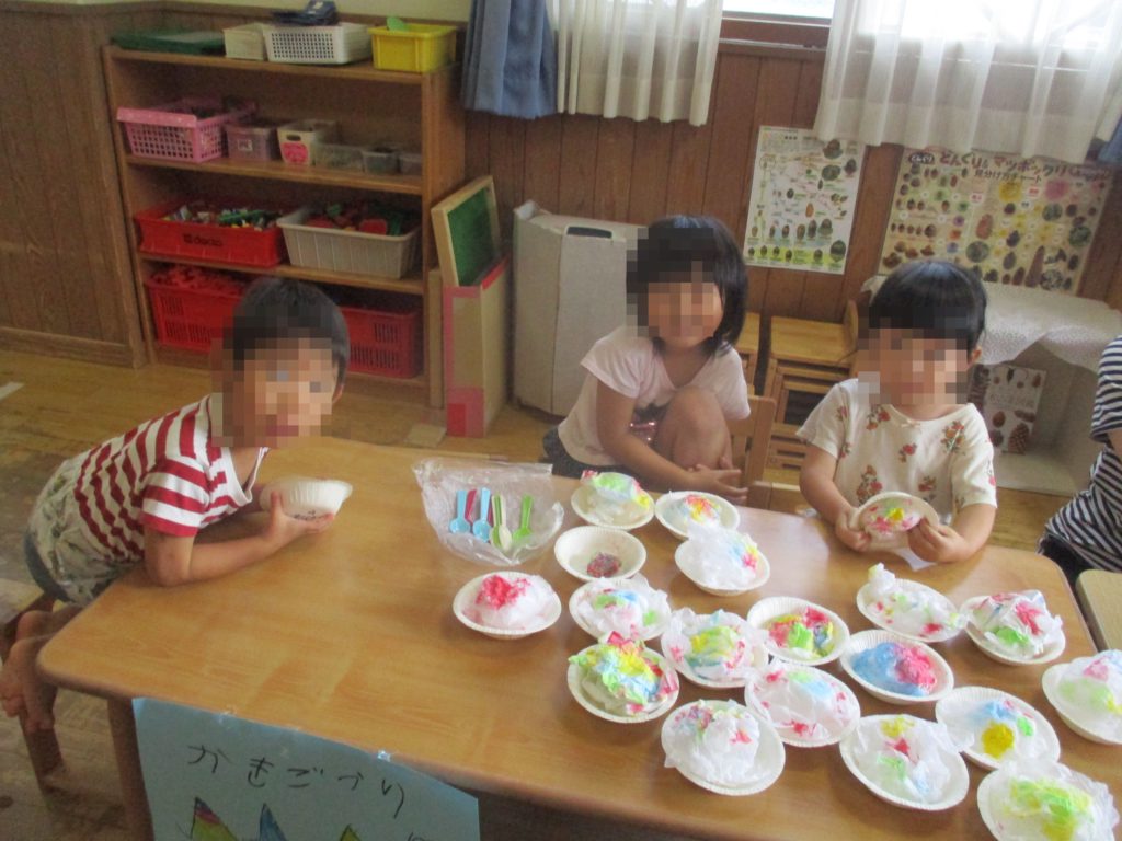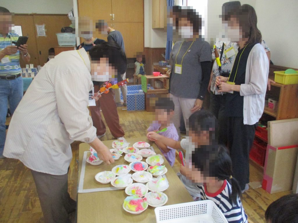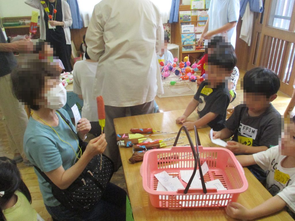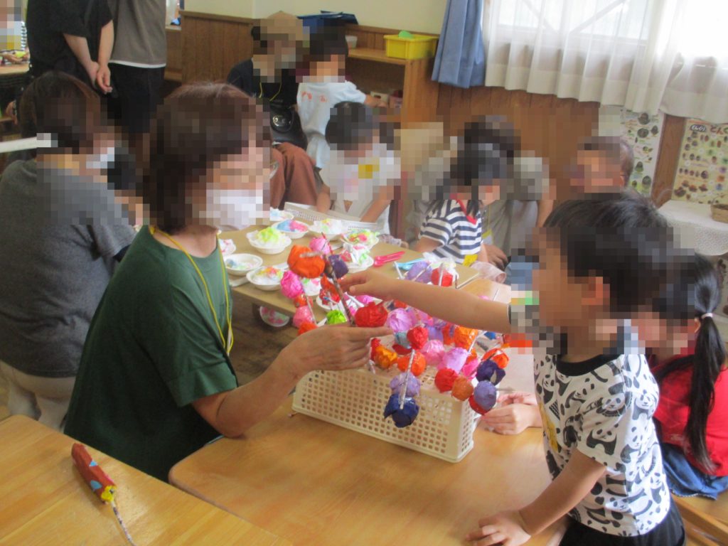 9月12日(金)におじいちゃんとおばあちゃんに保育園にきてもらい、いっしょにあそぼう会を行いました。 チョコバナナ屋さんやかき氷屋さんなど、可愛い店員さんが接客しおじいちゃんおばあちゃんとのやり取りを楽しみました。