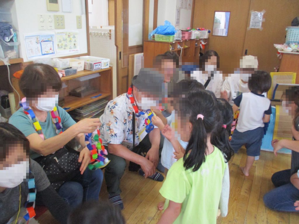 紙飛行機を一緒に折り紙で折って飛ばしたり、最後はプレゼントを渡しました!大好きなおじいちゃんおばあちゃんが保育園に来てくれて嬉しかったね😊