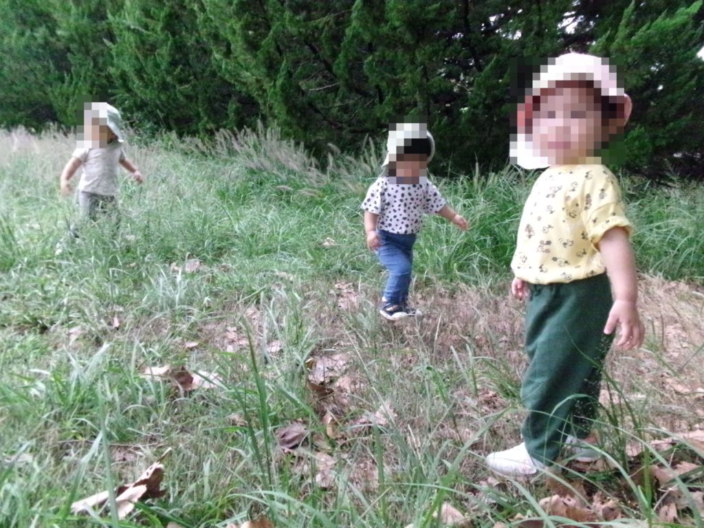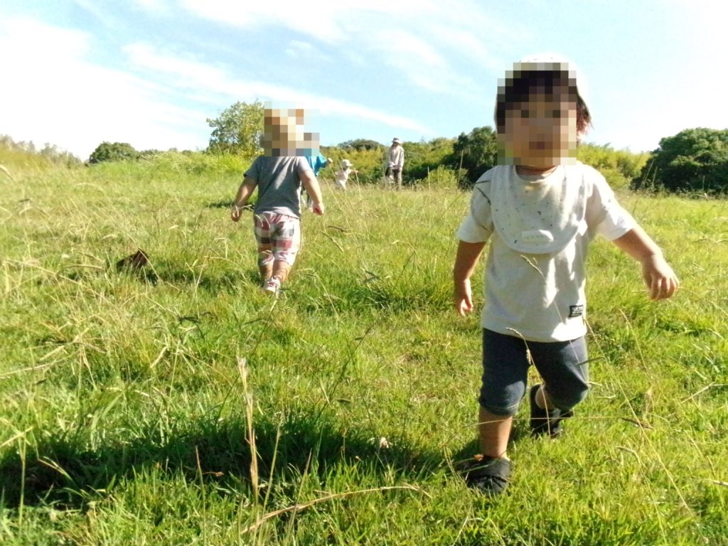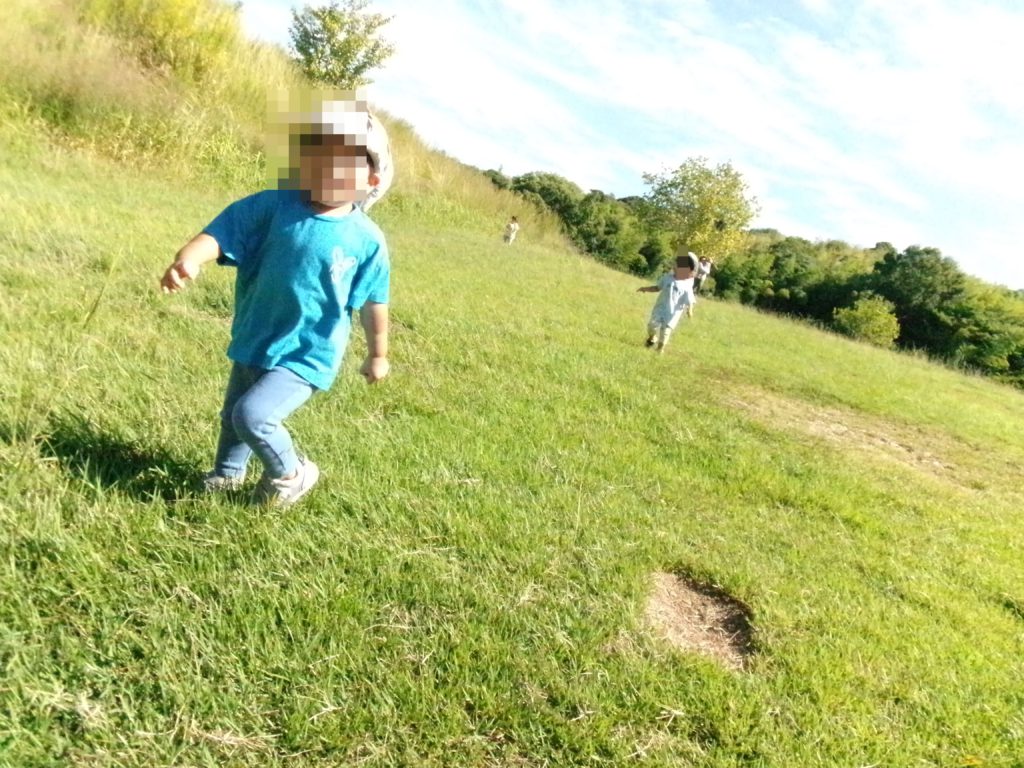 足腰の力がついてきたので広い芝生斜面も転ばずにスイスイと登れる子が多くなり、走ったり追いかけたりしながら何往復も芝生斜面を上り下りしました。