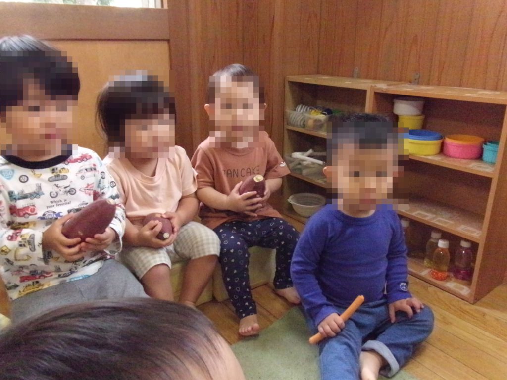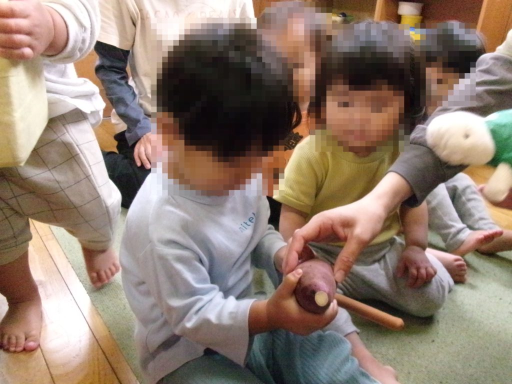 大きなさつまいもを両手で持ってよく見て触って確かめていました。