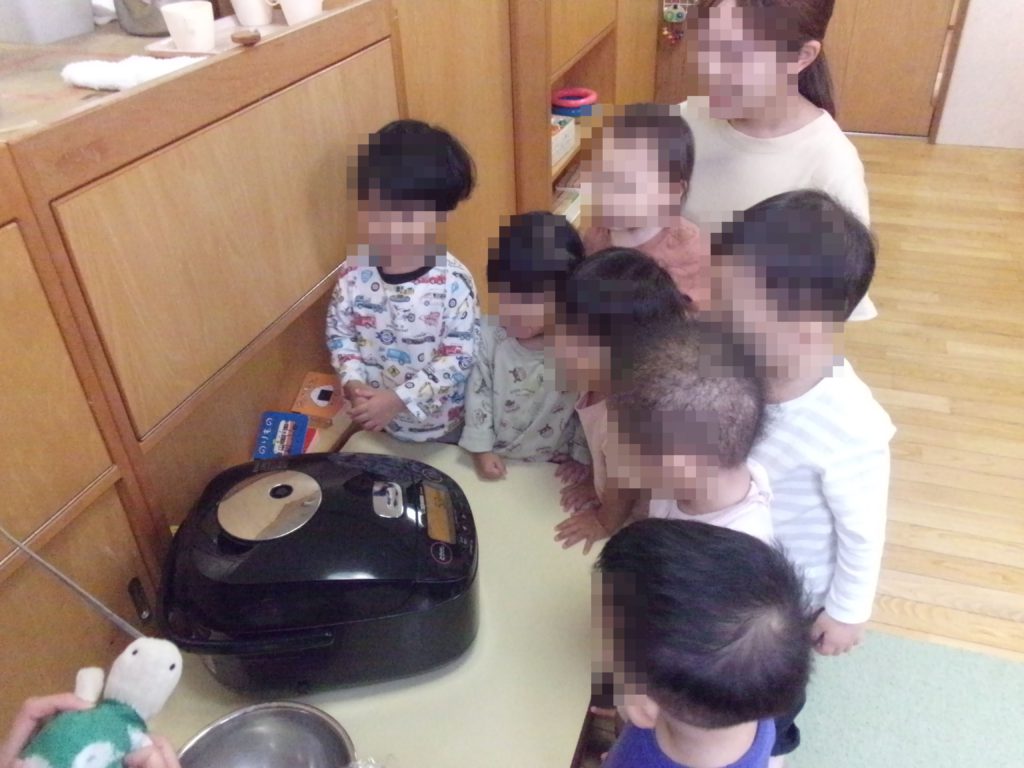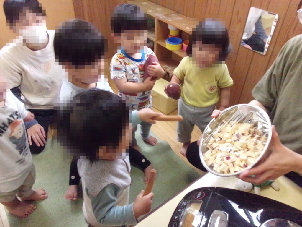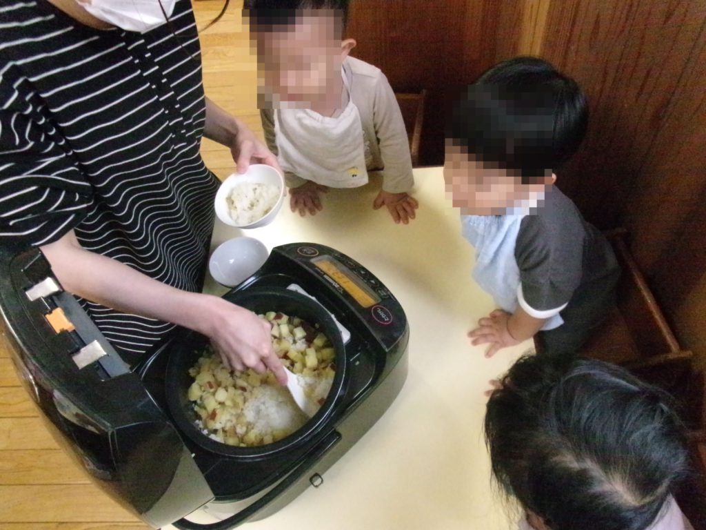 小さく切ったさつまいもをお米が入っている炊飯器に入れて、みんなで「おいしくなあれ!」とスイッチON。
