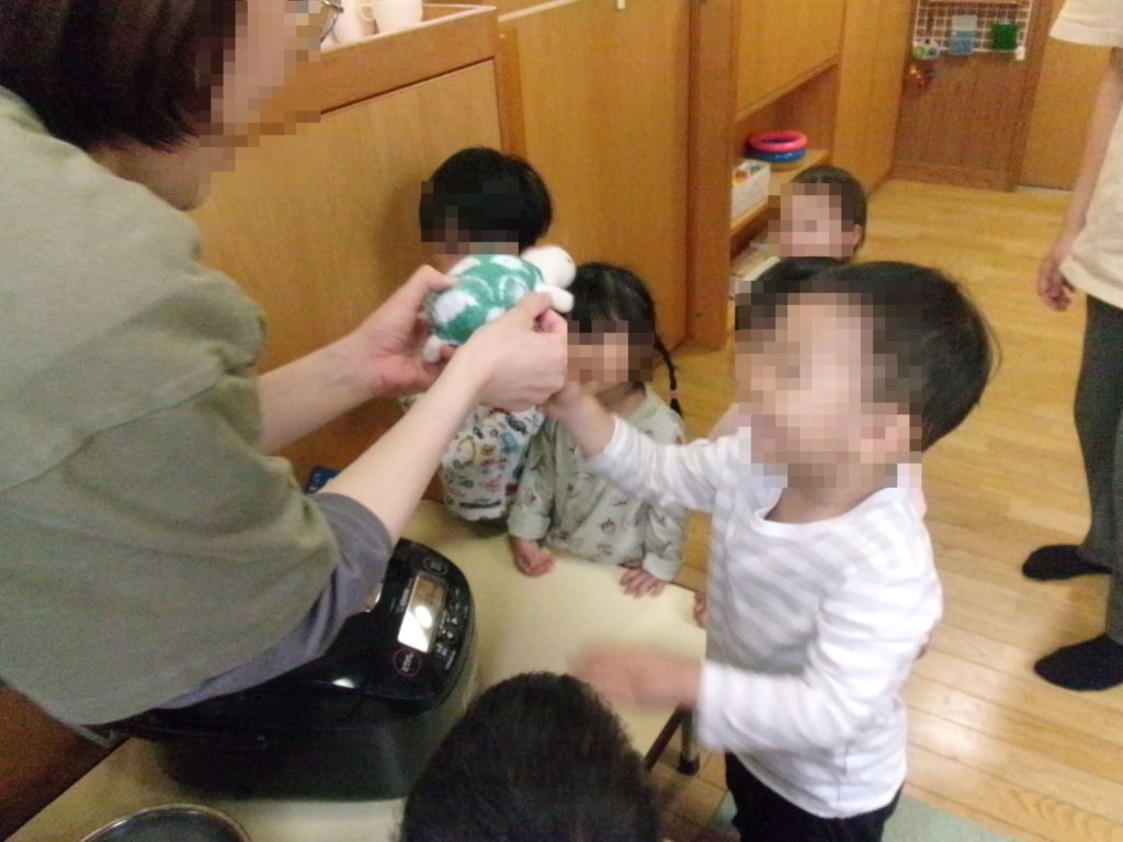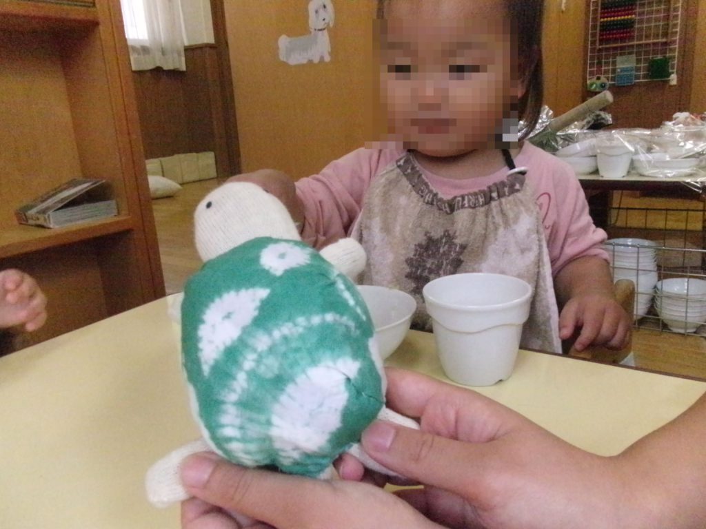 ある日・・・親しみのある大好きなカメの人形が大きなさつまいもと炊飯器を持ってクラスに来てくれました!