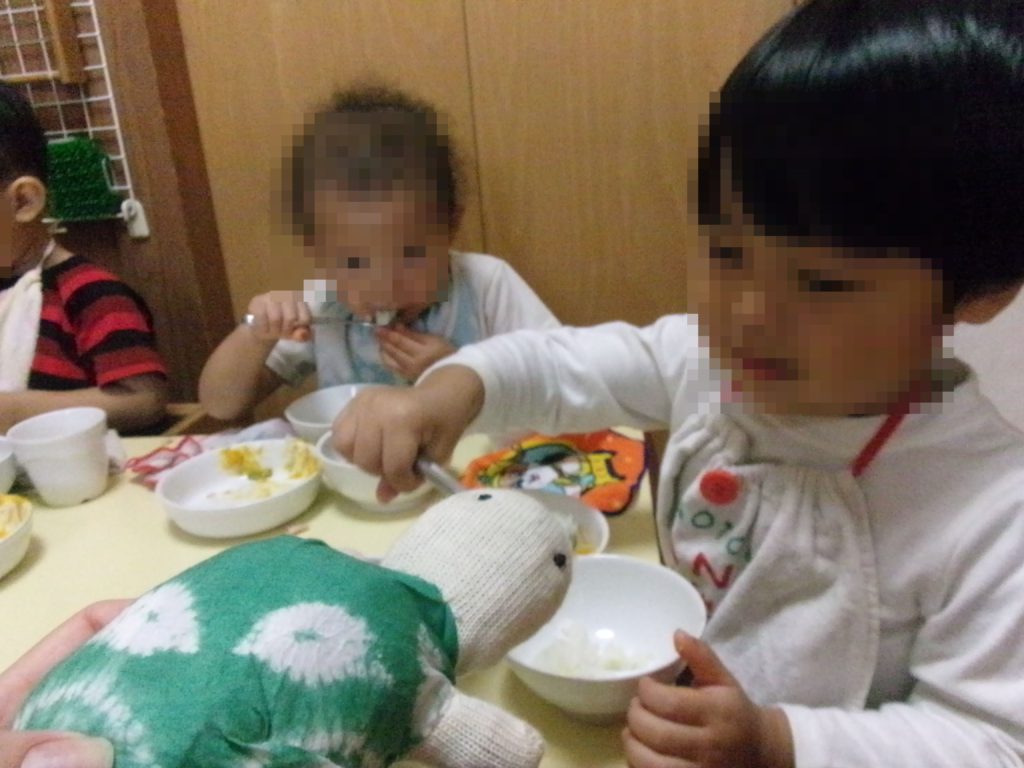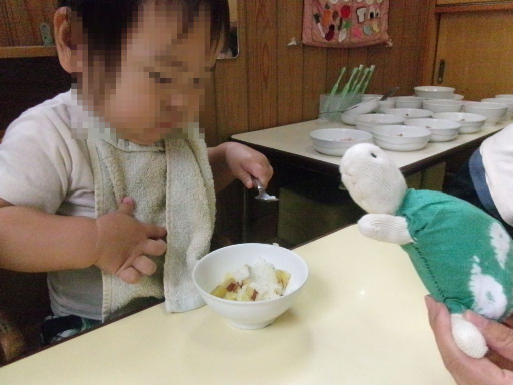 お部屋で炊いたさつまいもごはんはカメの口元に「あ~ん」と運びながら、子どもたちもたくさん食べていました。