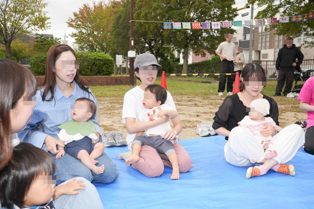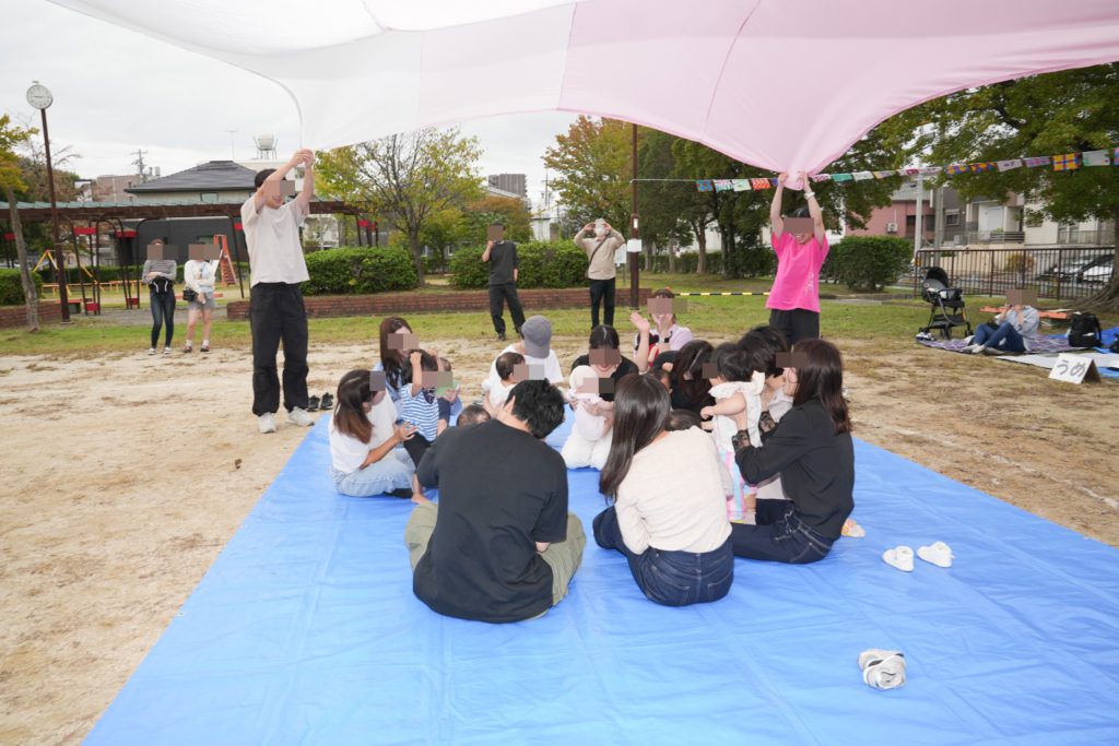 親子いっしょにブルーシートの上で日頃楽しんでいるわらべうたやふれあいあそびを楽しみました。