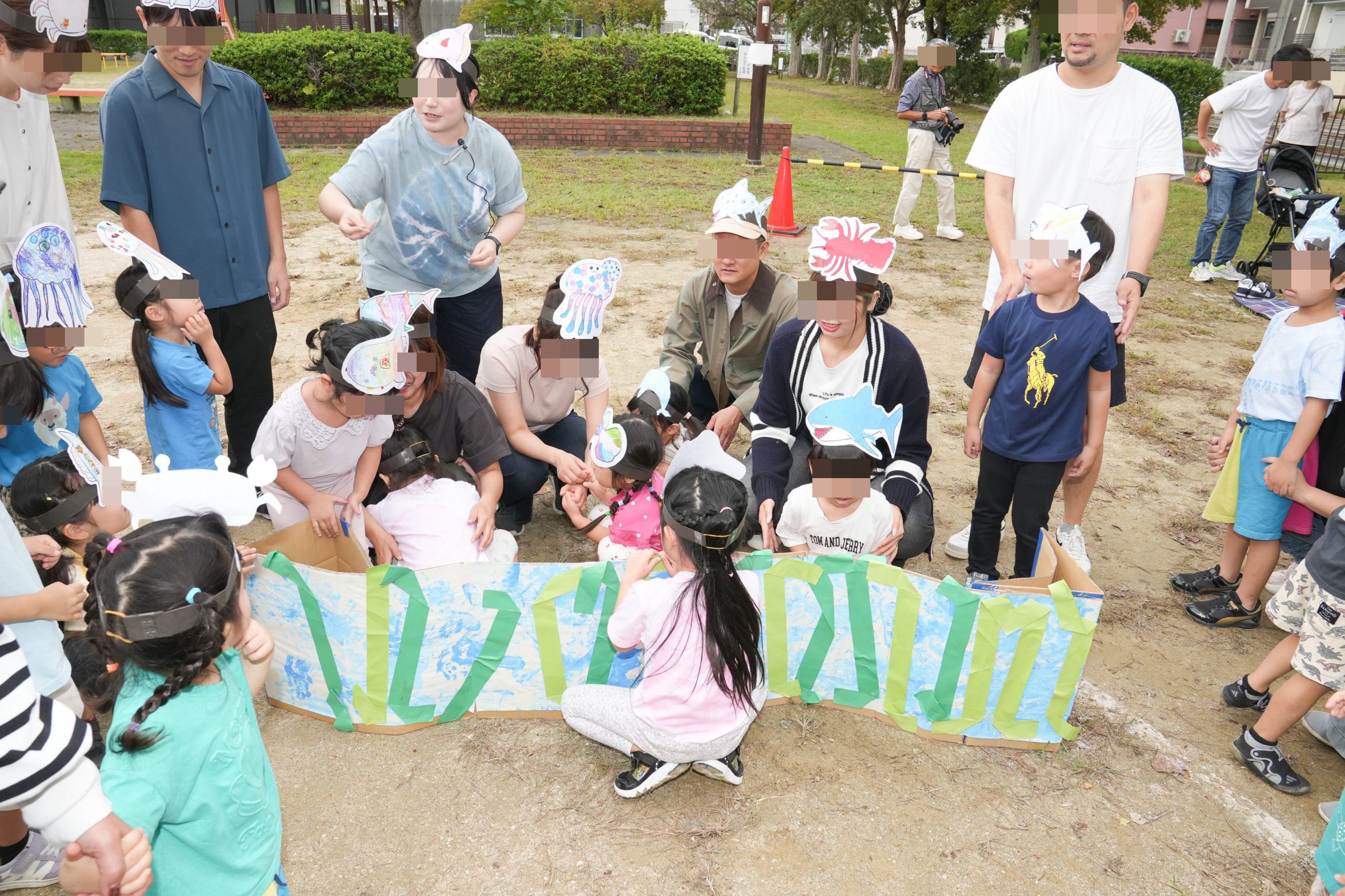 プールを楽しんでいた時から魚のつもりになることが好きな子どもたち。運動会当日は自分たちで作った好きな魚のお面を親子でつけて魚に変身!いろいろなお魚たちがお散歩をしていました。疲れてわかめを食べて休憩していると・・・