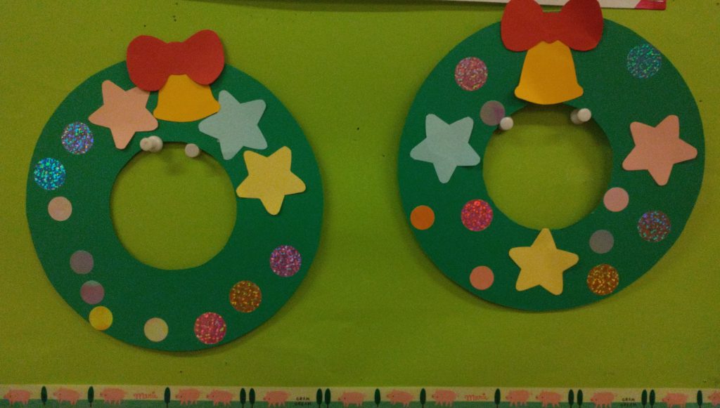 〜リース型の画用紙にクリスマスにちなんだパーツを貼って、素敵なリースを作りましょう。12/19(金)まで作れます。