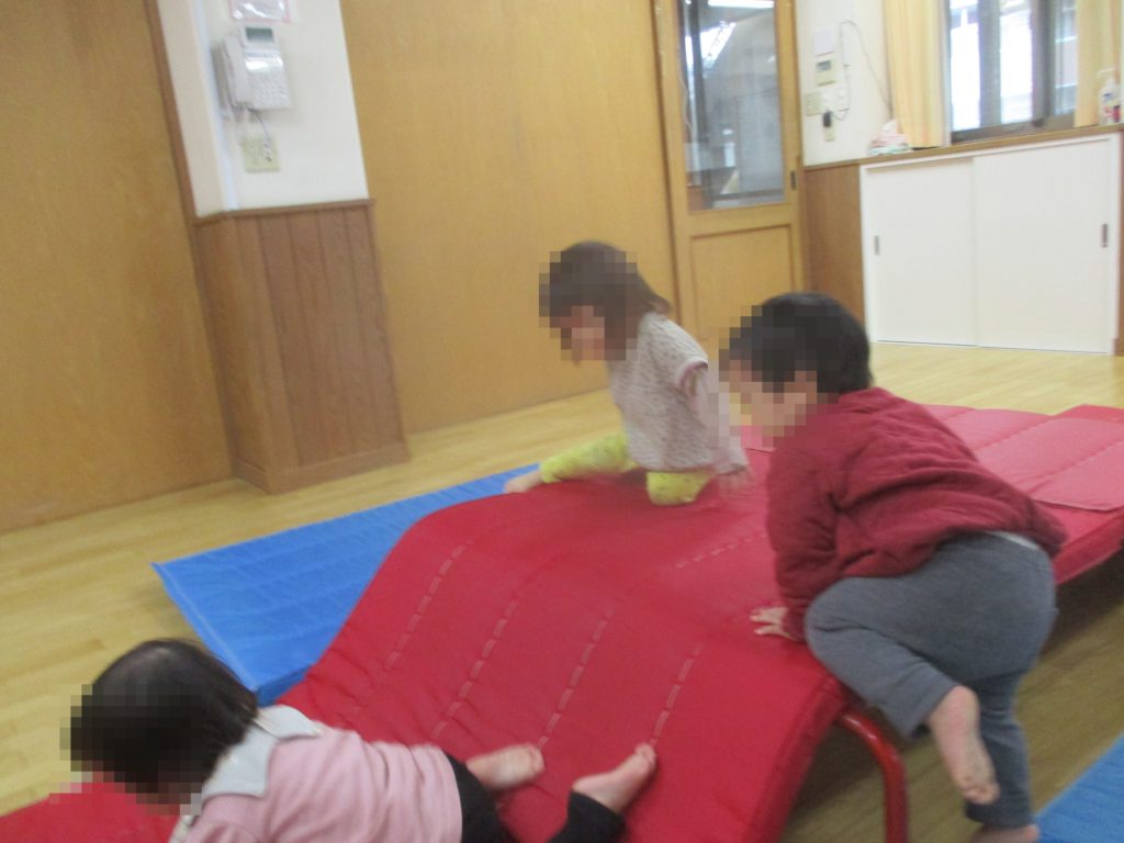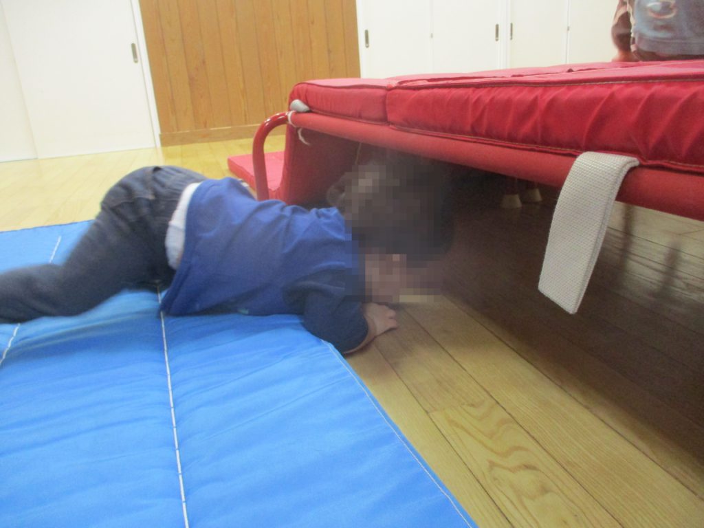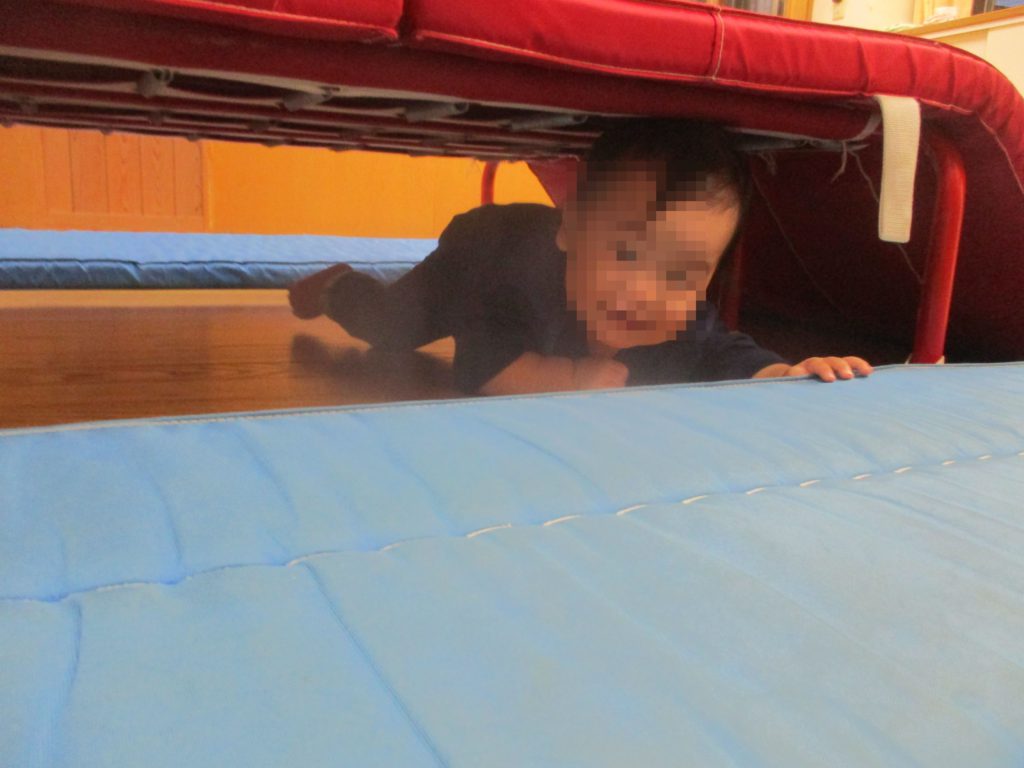 よじ登ったり、ベンチ山の下をトンネルのようにくぐったりして、室内でもたっぷり身体を動かしてあそんでいます。