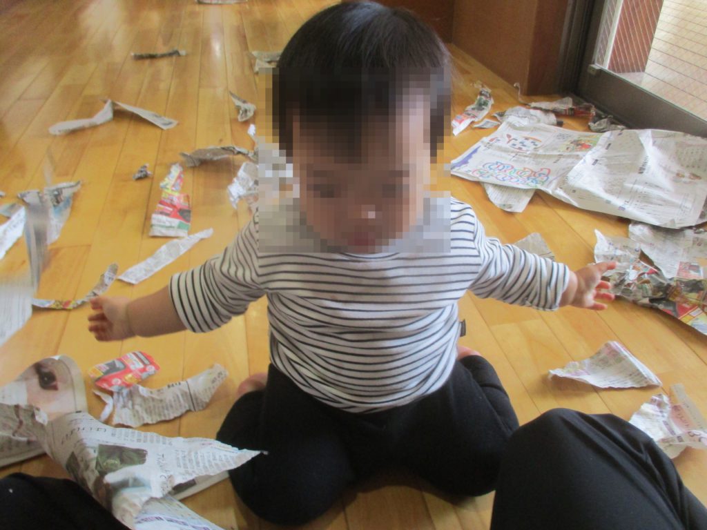 細かくちぎった新聞を両手でじっくり触る子がいたり、自分で新聞を破ろうと力をこめても中々破れず苦戦している子がいたりと、思い思いに遊んでいます。