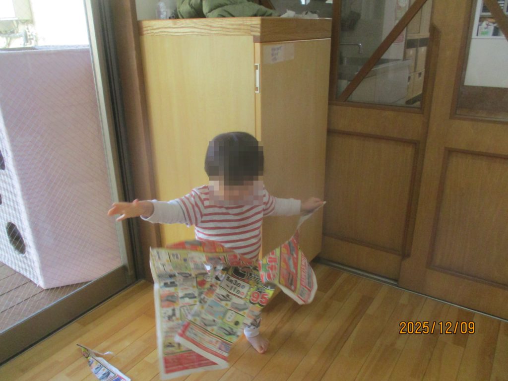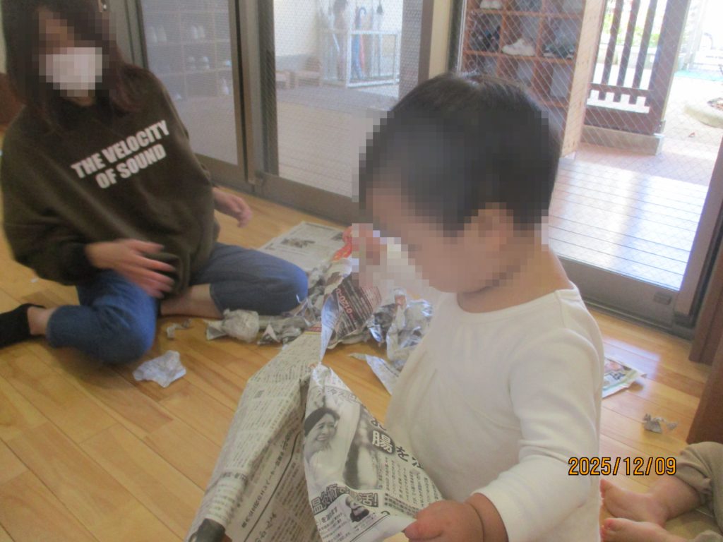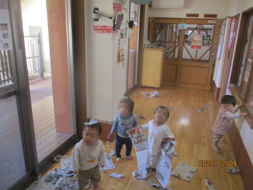 給食室前のはっぱの部屋では新聞をちぎったり、丸めたりして新聞あそびを楽しんでいます。