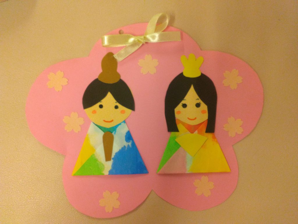 〜桃色の台紙に折り染めで作った着物、顔や髪の毛、扇子やしゃくのパーツを貼って、おひなさまを作りましょう🎵親御さんのみでの製作もできます。※製作パーツがなくなり次第、終了となります※