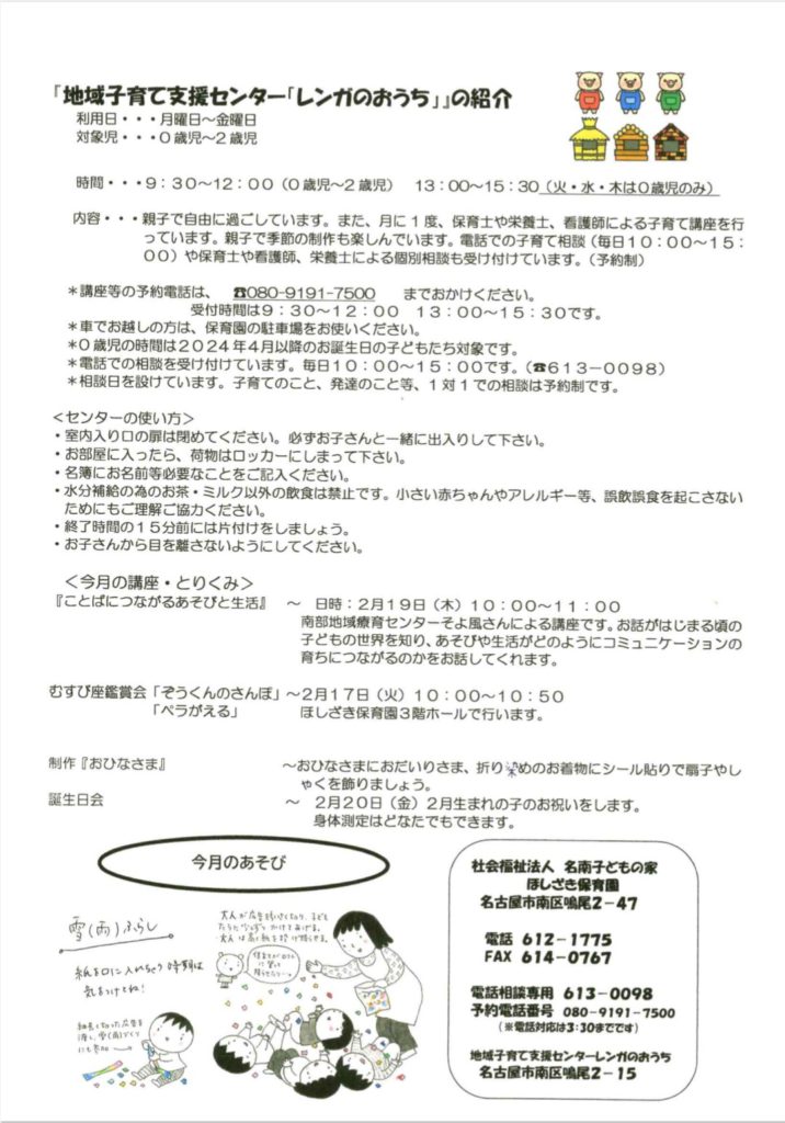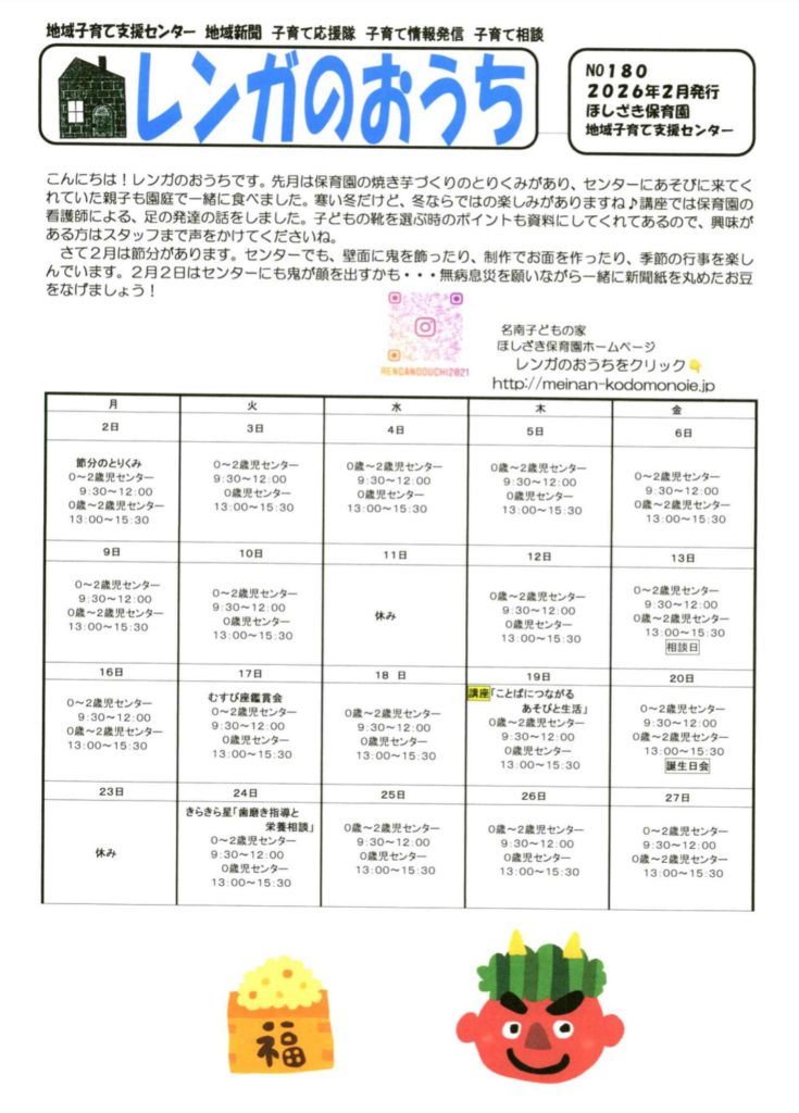 冬本番で寒い日が続いていますが、レンガのおうちには連日、皆さん元気に遊びに来てくれています。1/27(火)の学区子育てサロン⭐きらきら星⭐「成長の記録(手型・足型スタンプ)」には14組17名の親子が参加されました。皆さん、とても素敵な作品が出来て喜んでおられましたよ(^^)2月は、むすび座さんの人形劇鑑賞会や、南部地域療育センターそよ風の言葉の講座、⭐きらきら星⭐は「歯みがき指導と栄養相談」があり、南保健センターのスタッフの方とお話できます。2/2(月)は節分👹の取り組みも午前中に行う予定でイベント目白押しです。寒さを吹き飛ばして、ぜひ遊びに来てくださいね🎵