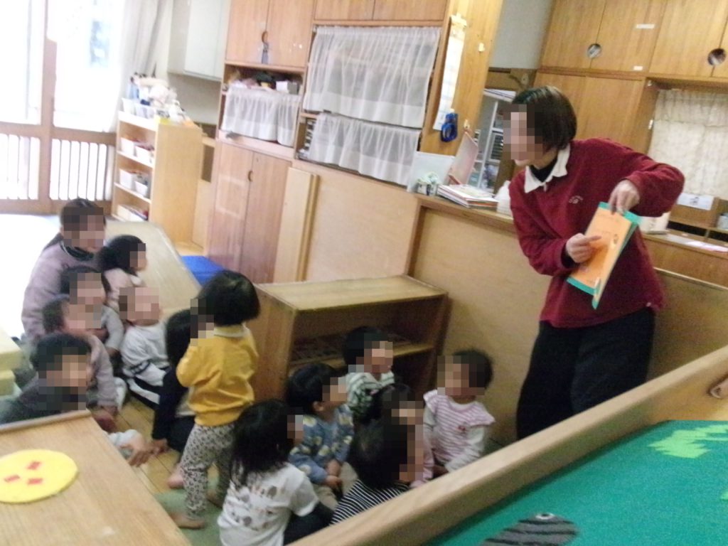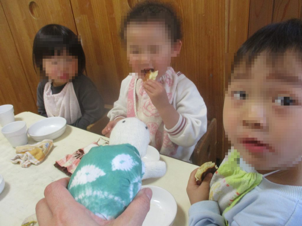 おやつの時間になると、給食室の職員とカメさんがクラスにあそびに来て「カメ来たー!」と大興奮!