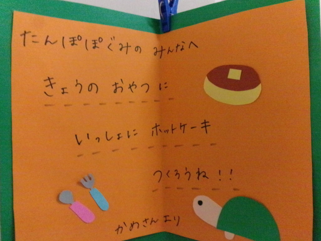 手紙の内容を子どもたちに伝えると「やったー!おやつにカメ来る!」と大喜びでした。