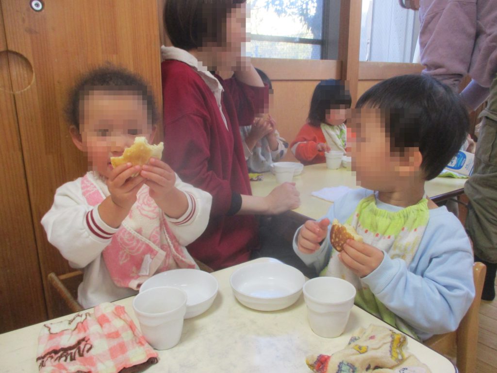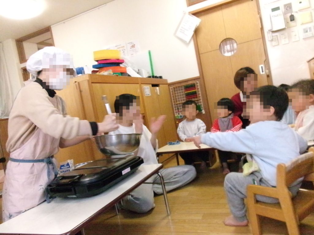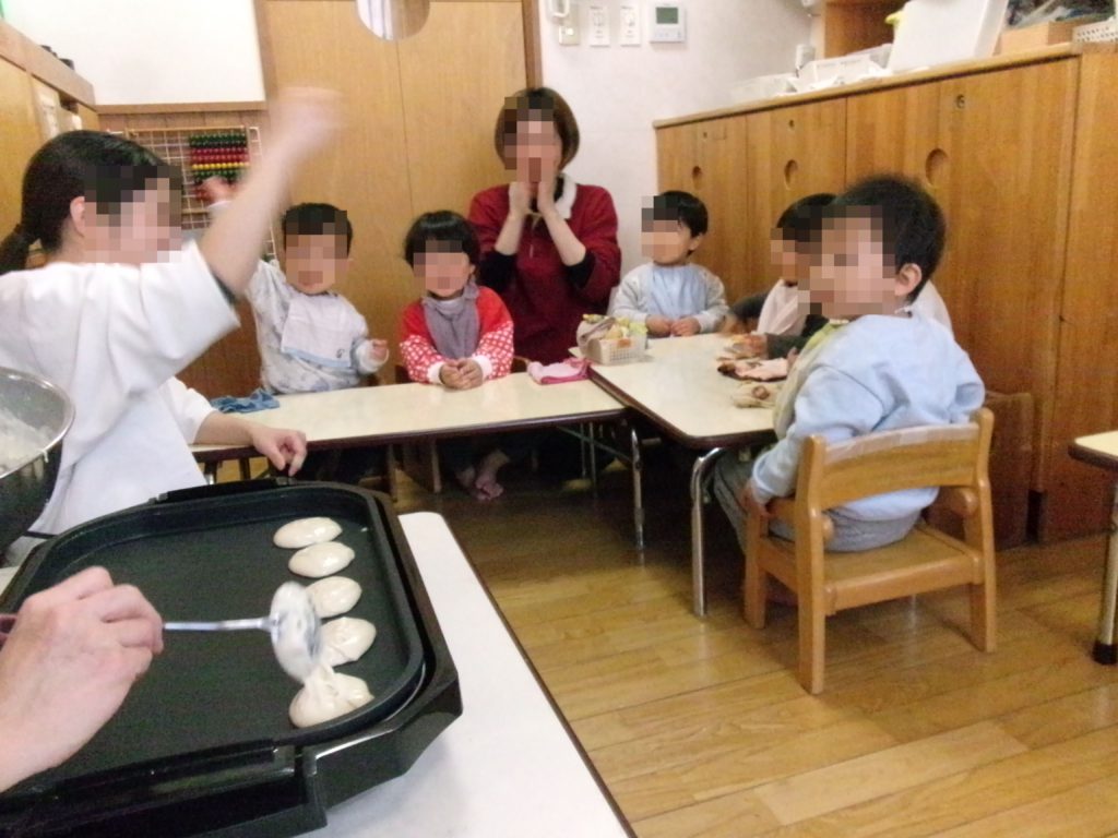 完成したホットケーキを子どもたちに配ると、「あっつ~おいしい!」「あま~い」とたくさんおかわりしていました。