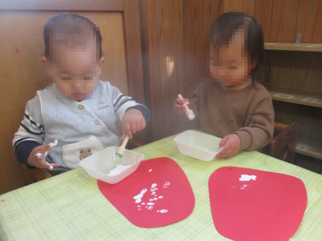 タンポで優しくトントンと色をつけたり、手に白い絵の具をたくさんつけて「ついたー!」と嬉しそうに大人に見せたり、色々な模様のダルマが完成しました!