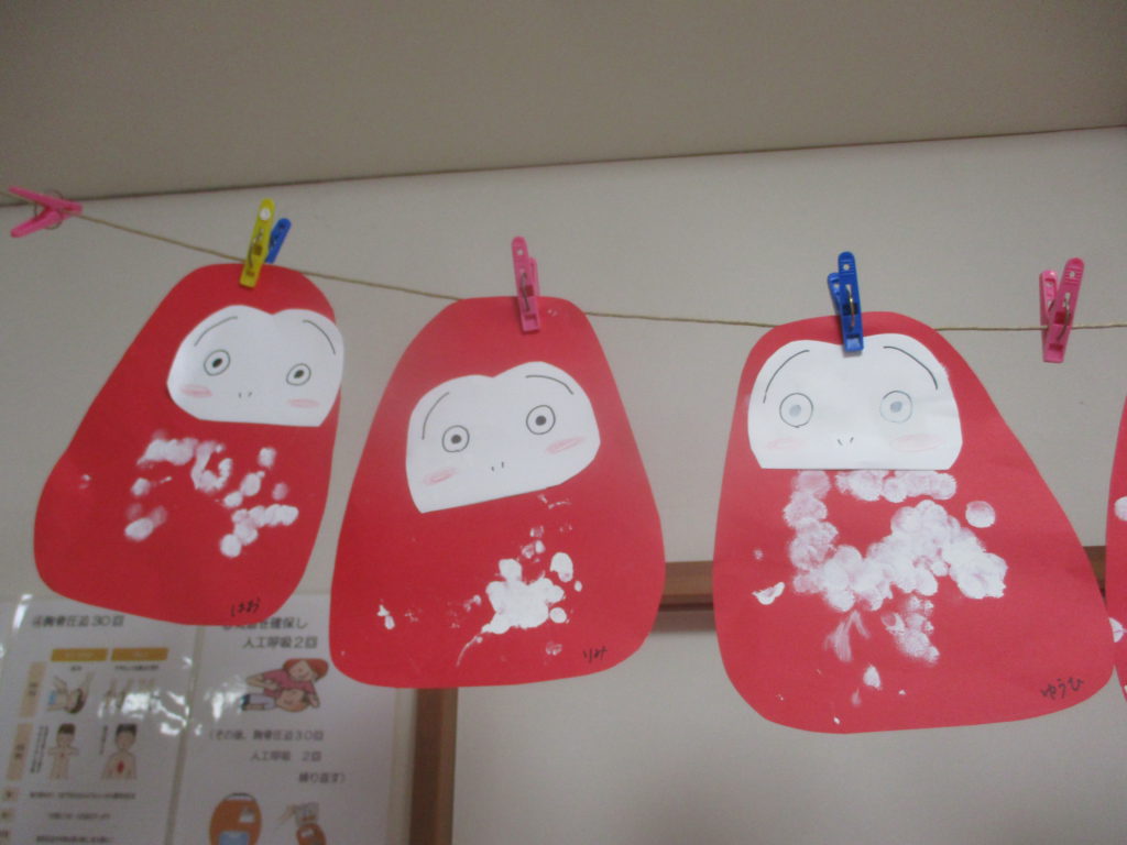 ダルマをお部屋に飾ると「作ったね~!だ・る・ま・さ・ん・が・どてっ」と子どもたちから絵本のフレーズを口にして喜んでいます。