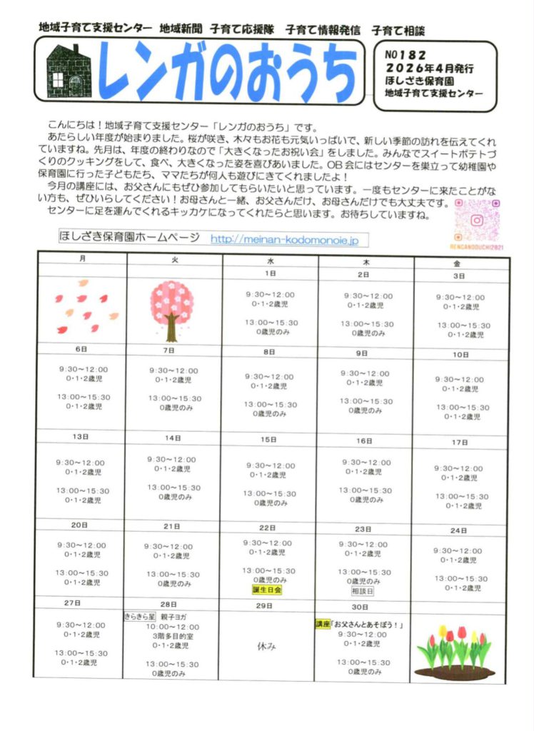 新しい年度が始まりました。桜が咲き、木々もお花も元気いっぱいで、新しい季節の訪れを伝えてくれていますね。今月の講座は『お父さんとあそぼう!』です。ゴールデンウイーク中でもあるので、お父さんにぜひ参加してもらいたいと思っています。一度もセンターに来たことがない方も、ぜひ、いらしてください!お母さんと一緒、お父さんだけ、お母さんだけでも大丈夫です。地域子育て支援センター「レンガのおうち」に足を運んでいただくキッカケになればと思います。 講座に限らず、普段からお父さんの参加も、祖父母とお孫さんでの参加も大歓迎です。お待ちしています(^^)