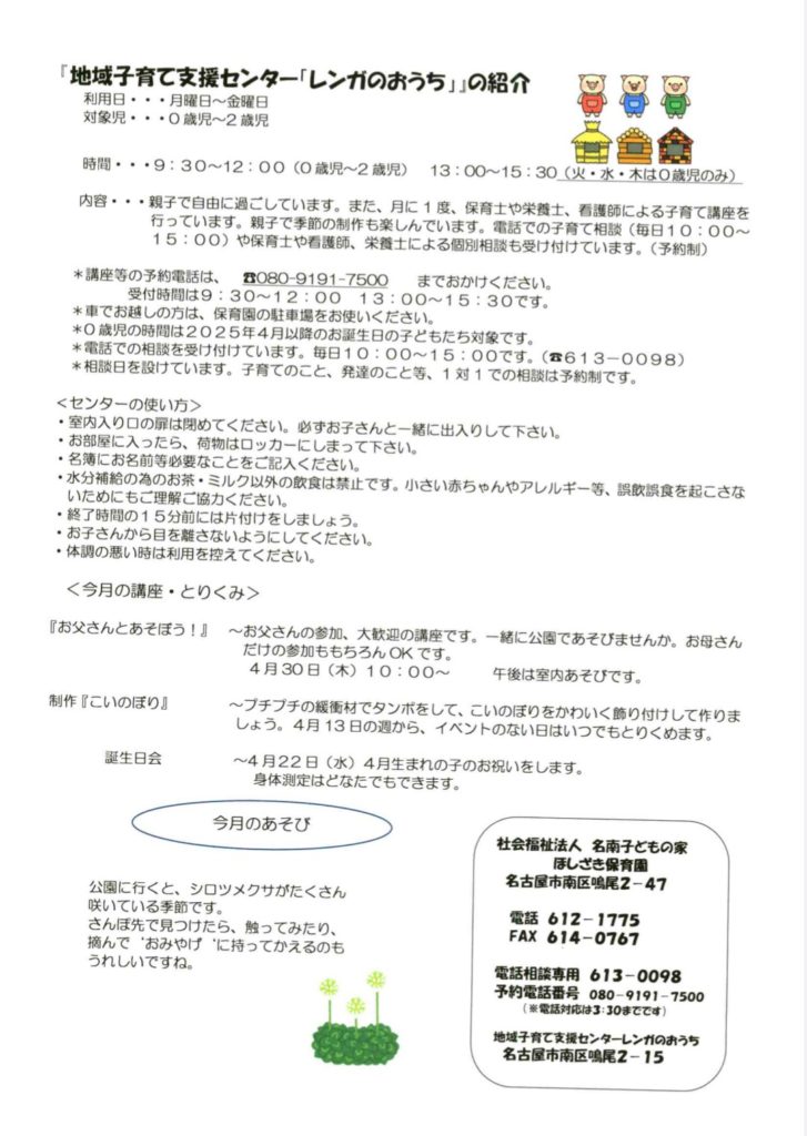 4月上旬はまだ学校も春休みのため、午前・午後とも放課後デイサービスの送迎車の出入りがありますので、お車でお越しの際や、ほしざき保育園の駐車場からセンターまで歩いてこられる際なども、十分にお気をつけください。