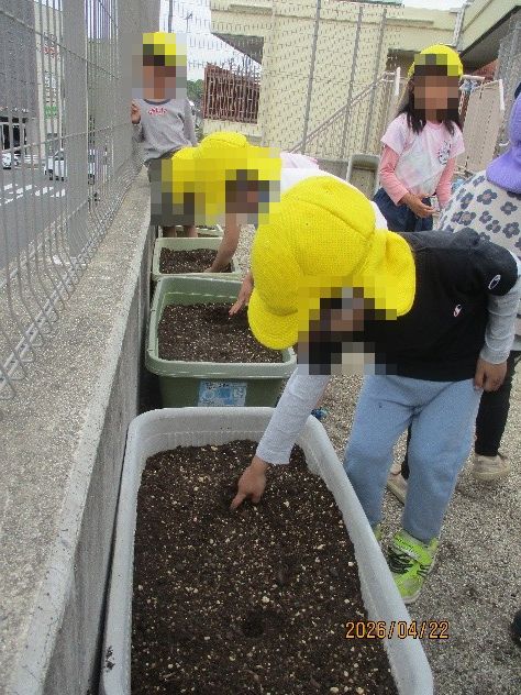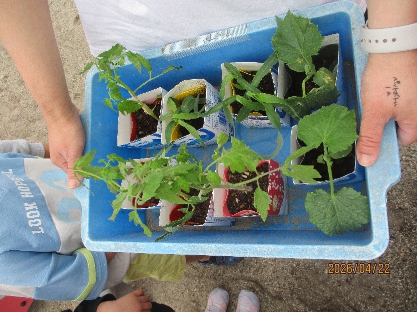 さくらさん(5歳児)が代表でカインズで買ってきた野菜の苗をひかりさんの皆で苗植えをしました。