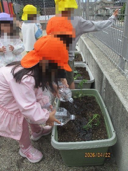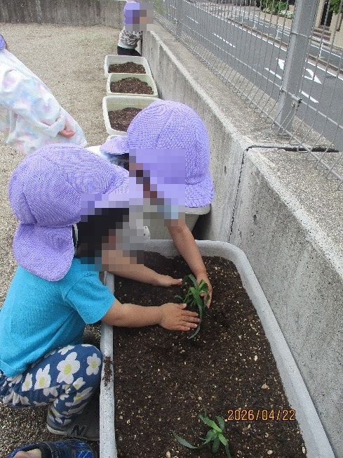つばき(4歳児)さんはポットから苗を優しく取り出して、さくら(5歳児)さんは苗を植える穴をあけ、最後にもみじ(3歳児)さんが優しく土を被せました!皆で心を込めて育てています。大きくなりますように🥬